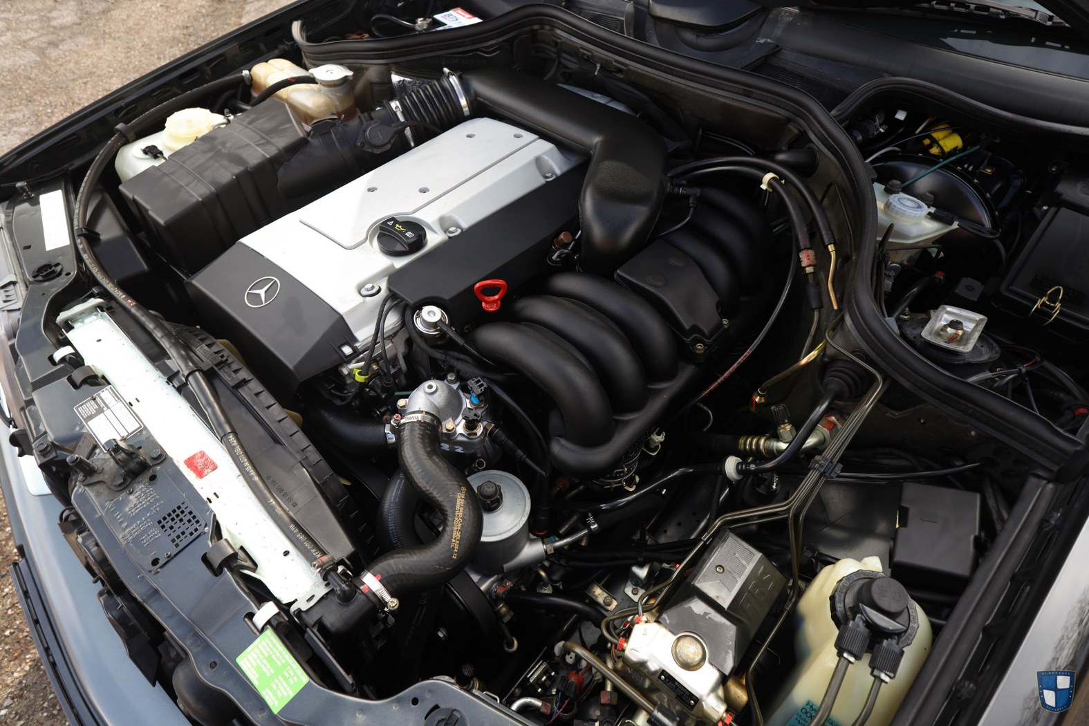 The engine-bay of the car is very original. Factory details and tags and the silky smooth 3,2L M104 engine. Everything is clean, untouched and all plated parts are excellent, the sticker on the valve cover is still present and the hood insulation is still the original.