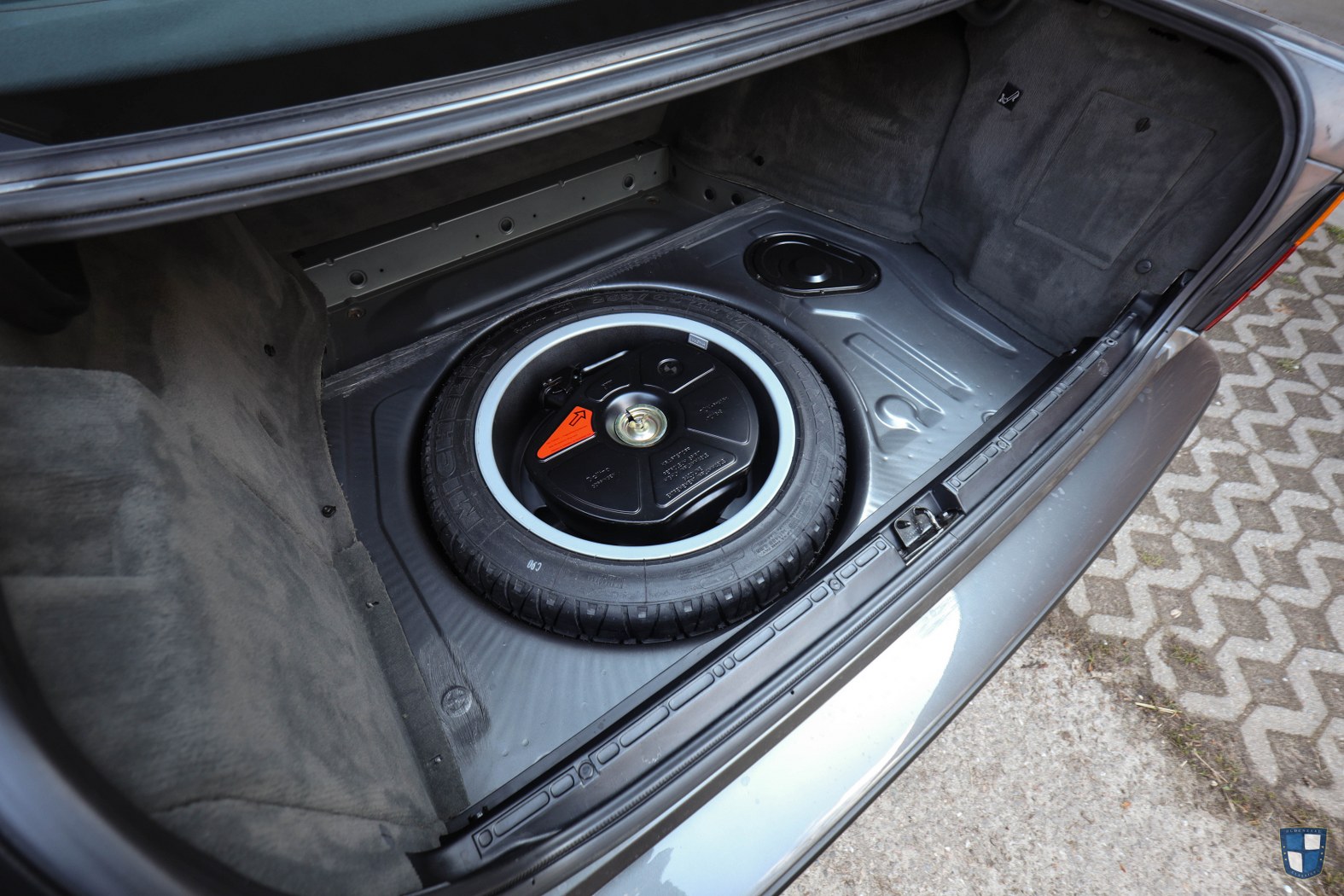 In the trunk we find the full set of tools, a clean trunkmat, a never-used spare and original BMW spare fuel canister – fantastic.