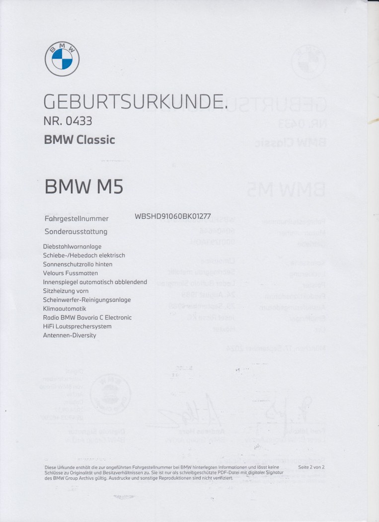 An early M5. Built on the 24th of August 1989 and delivered to BMW Dealer Josef Risse KG in Höxter on the 29th of September 1989. The car was ordered and driven new by a doctor, born 1927 from Höxter. The man had quit driving this car in 2006 and in 2014 his son sold the car to a BMW-fan from the Berlin area who kept the car until 2021 after which the car was sold to Austria. Now in our collection and very proud to offer this amazing quality M5.